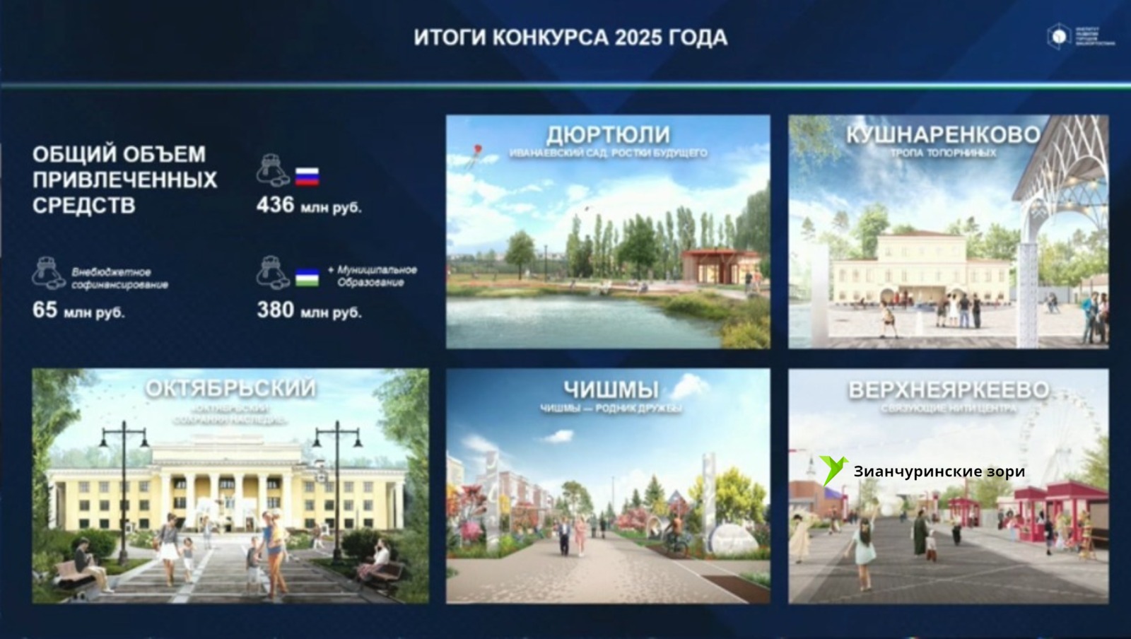 Победителями конкурса 2025 года стали несколько городов и исторических поселений, включая Дюртюли, Октябрьский и Кушнаренково, а также крупные села Чишмы и Верхнеяркеево. Общая сумма привлеченных средств составила около 436 миллионов рублей. На данный момент у республики 39 побед в проектах на сумму более 3,3 миллиарда рублей.